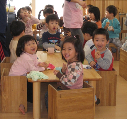 「どんぐり的おやつの様子」です。 今日のおやつは「蒸しパン」でした! 「どんぐり的おやつの様子(邪魔する人あり)」です。 邪魔をしたのはえんちょうです。 (↑先生方、どうもすみません) 基本的に笑顔が好きです。 子ども達も先生方も「笑顔が多く、笑いが絶えない園」が理想ですね。 笑顔が多く、笑いが絶えないと、雰囲気も明るいでしょうし。 子ども達の笑顔に作り笑いは無いのが、心を和ませてくれます 「子ども達に付き合いで笑ってよ・・・。」といっても、笑ってはくれません。 大人もそういうところありますよね、明らかに営業スマイルとわかる人 (↑表現古すぎ) 作り笑いなんだろうけどいやみの無い笑い方の人 心から笑っている人とか・・・。 だいたい、心から笑っていない人の笑い方って 目が笑ってないからわかりますよね。 口から出て来る言葉も表情とアンバランスだし・・・。 「笑顔は周りの人を幸せにする」と聞いたことがあります。 「心が健康な人は、上手に笑うことが出来る」とも聞いたことがあります。 大切にしたいものですね・・・。 週末は又、寒くなりそうですね。 皆様、風邪を引かないように。 良い週末を!! 解散!! PR