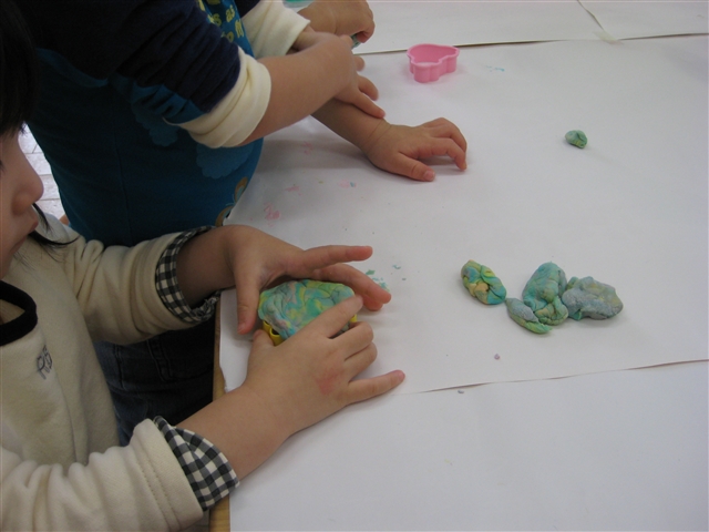 写真攻め!!? (↑誰ですか、手抜きだと言う人は(笑)) 今日は、「小麦粉ねんどで遊ぶ子どもたちの手」です。 皆さんは、自分のお子さんや他のお子さんの手に 注目したことはありますか? 形作る のばす けずる つっこむ・・・? たたく!! つまむ と、色々です。 こういう指先の動きや、指先の感覚も脳を育てます。 最近では、楽しい「小麦粉ねんど」も手が汚れるので 嫌うお友達がいたりしますが、もったいないなぁ~と思います。 「汚いから、やめなさい!」 「汚れるでしょ!!!」 「着ているものが汚れるからやめて!!」 遊びに出かけると、よく耳にするお母さんの言葉・・・・。 気持ちもわからないでもないですよね ひどく汚れれば、手洗いして→洗濯機かけて→ 干して→たたんで→たんすにしまう・・・。 大変ですよね・・・。 えんちょうもよく「洗濯物ぐらいたたんで!!(怒)」と よく怒られます・・・・。 子どもたちから、このような指先の運動や 感覚を鍛える場面を奪い取らない程度に 心で「頼むから、汚さないでく~れ~!」と願いましょう。 それでも、汚れてきた時はあきらめて下さい・・・。 お子さんが大きくなったら「手洗いの大変さ」を 一緒に体験させてあげましょう!! ほら!手洗いも指先の運動や感覚を鍛える場面ですよ!ねっ! 体調がすぐれない、えんちょうでした・・・。 かいさん!! PR