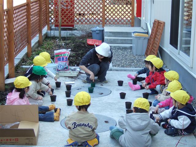 「たね植え」です!! きょうは、うさぎ組さんがかぼちゃ(食べれません・ハロウィン用お化けかぼちゃです) と、ひまわりの種をポットに植えました。 徐々に、春らしい活動を・・・。 ちなみに、えんちょうはどんぐり畑で1時間程度 鍬をふるったら、手にまめは出来るは、体は痛いは・・・。 『おじさん』だ・・・。 悲しいほどの運動不足・・・。 昨日、近隣の幼稚園の園長先生が お花とお祝いを手に「どんぐり」に来てくださいました。 どんぐりが「認定こども園」になったお祝いでした。 ありがたいですね。 心から感謝したいですね。 本当に嬉しかったです。ありがとうございました。 えんちょうとしては、どんぐりとして地域の子育てに 貢献したい気持ちはあります。 どんぐりだからお預かりできるお友達がいたり 認可保育園が空くまでの利用だったり 幼稚園の練習だったり どんぐりが良くて利用してくださる方がいたり 理由は何でも良いのです・・・。 だからといって幼稚園や認可保育園から 子ども達を奪い取ろうとは、考えていません。 どんぐりの近隣で生活する子ども達や保護者様が 何かあったら、『大丈夫「どんぐり」がある』と 思っていただけると 嬉しく思います。 そうそう、実はえんちょうにまたもや、試練が!! 今週の土曜日!! おやめになった先生の結婚披露宴での 『上司の挨拶』!!!!!! 前回、M先生の結婚式の挨拶では 本番前からいっぱいいっぱいになり その場では、本気で「真っ白」になり 『あ~~、やりやがった状態』のへなちょこえんちょうは 既に緊張バロメーターが上昇中!! (↑おいおい、今からかい・・・。) さあさあ、挨拶考えて、先生にプレゼントするDVDの製作に 精を出しますか・・・。 違う意味の残業が始まるぞ~~!!みんな集合!! (↑誰を呼んでるの?) PR