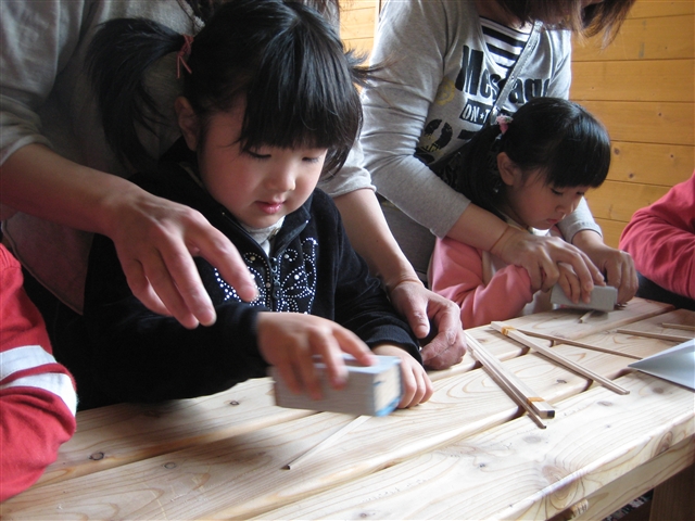 写真が溜まりに溜まって・・・。 言い訳する時間も無いので えんちょうが勝手に決めた決定事項のみ お伝えしますので、よくよくご確認下さい・・・。 (↑謝る姿勢は、全く見られません・・・・。) 本日より過去にさかのぼって日記を書きます。 え~、本日は真に勝手ながら 4月20日日曜日及び4月21日月曜日です!! さぁ、行ってみよう!!! (↑ここに来ても、謝る姿勢はありません) 4月20日日曜日に「森のようちえん」の面々は 「マイ箸」を作りに、大沼に行ってまいりました!! 見てあげてください、真剣な表情で作る自分の宝物です!! 親子の手の触れ合いや、関係を垣間見る事が出来る写真ですね! 箸を頑張って作っていると「ぽ~~~~~!!」と SLの汽笛!!! 頑張った、ご褒美!かな? 真剣に見つめる、森ようの面々でした!! SLも今度見に行こうね!! 初夏を思わせる、日差しの中での一日でした!! さぁさぁ、行きますよ4月21日月曜日だ!!! 怒涛の「森のようちえん」in大沼森林公園です!! 「いゃっほ~~~~~~~い!!」 一人のお友達が、この坂が面白い事に気付くと わさわさと、移動を開始する森ようの面々 登ったと思ったら、ゴロゴロと転がり 葉っぱだらけ、ズボンはあっという間に茶色に・・・。 でも、転がっているお友達の笑顔に注目!! 「森のようちえん」とは、園の教育目標に向かい それを達成するする為の手法です。 「モンテッソーリー」 「シュタイナー教育」 といった、ものと同じと考えていただいて良いと思います。 それぞれの教育手法には理念や願いが込められています。 「森のようちえん」では、「環境教育」を基本として、子ども達が 自分で考え自分で行動できる力、人間本来の自然との関係を 築く(気付く)事が出来るように、との願いを込めています。 どんぐり「森のようちえん予備校」の方々の活動も 見逃せませんよ!! お散歩に行くだけで、発見いっぱい!! 「お~~~」「ほぉ~~~~」 子ども達の「気付き」は、とても大切です。 「不思議だなぁ~」と言う気持ち、それを一緒に同じ目腺で 受け止めてくれる、大人の存在が、どんなに大切なものか 我々大人は、忘れてはいけないと思います。 更新が遅くなって、ごめんなさい。 明日は4月22日+4月23日で・・・。 ねっ。 就寝・・・。 PR