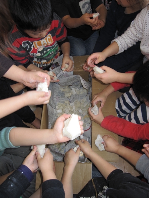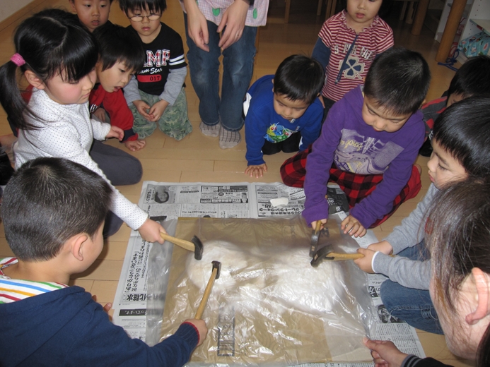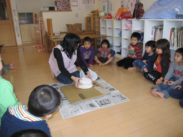 本当は、1月11日なのですが、祝日だからねぇ~。 どんぐりで、お友達がついたお餅で作った 立派な鏡餅を、とんかちで「バン!!バン!!」と そして、みんで「ポロポロ」と・・・・。 このお餅をよ~くよ~く乾かして!! 油で揚げると!!!! それはそれは、素敵な「お・や・つ」に変身するのです!! 楽しみだなぁ~!! えんちょうは、子どもの頃祖母が作ってくれる その揚げ餅??が好きでした。 こういう、昔ながらの行事や伝統的なことを 子ども達へ伝えてえることも とても、とても大事な事で・・・。 そんな、こんなでどんぐりの新しい一年が スタートしています。 少~しずつ、「どんぐり de show」の 足音が聞こえるような、聞こえないような・・・! さぁさぁ、3学期もみんなで楽しんで行きましょう!! それでは!! 解散。 |