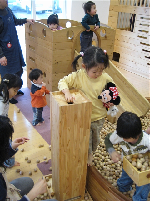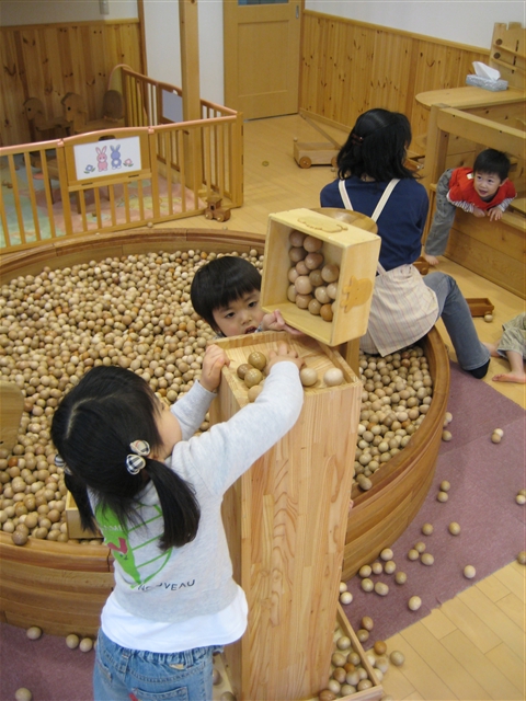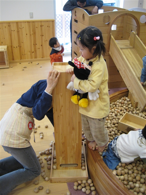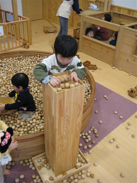 はい!今日のどんぐりさんは!! 「あたらしい、おもちゃが来たぞ!!」の巻 今回も「大工さんの手作りの木のおもちゃだぞ~!」 さぁ、さぁ!見てみよう!! 箱の上には、木コロ一個分の穴!! 下には両サイドに大きめな穴!! このように上の穴から木コロを落としますと 「コロ!カラ!コロ!カラ!」と良い音を立てながら 落ちて、最後に下の穴から出てきます。 しか~~~し、そのままで遊んでくれないのが どんぐりの愉快な仲間達!!!??? あはははははぁぁぁぁ・・・・・・!?! 「がらがら!ガラガラ!」 「がら!ころ!カラ!ガラ!コロ!から!」 「ごろ!コロ!カラ!ゴロ!から!ころ!」 楽しい遊びの発明家の方々でした!! ちなみに、このおもちゃの名前は・・・・・? たぶん、誰も知らない・・・。 こういう時って、みなさん 「あれ!」とか「あの、新しいやつ!」とか 面白い表現しますよね!! おっと、お仕事に戻りましょう!! それでは・・・・。 解散!! |
