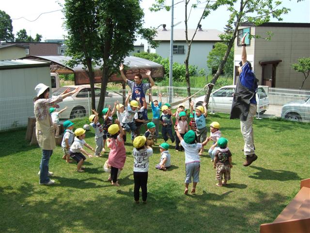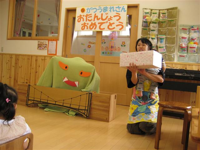 「6月のお誕生会!!」です。 何は、ともあれ写真をご覧ください。 ひとつひとつ解説しますか? その1、お化けのいる橋の向こうにある、お誕生日カードを 取りに行く必要有り・・・!。 その2、お化けに圧倒される方々・・・。 その3、最後には、やはりお化けのいる橋の向こうにある宝物?を 取りに行く必要有り・・・!。 うさぎ組の3人の勇者により、お化けは撃退され どんぐりのお友達は、めでたく、宝物の中身のお菓子を 頂くことが出来ました!!! なかなか、迫力のあるお誕生会の出し物でした!! 今週のお父さんは!! 子ども達とパエリアを作ろう!!です。 あす、チャレンジしてみます! たんに、お父さんがパエリアを食べたいからだけなんですが・・・。 でも、お父さんは食べ過ぎると・・・・なので、適度にします。 それでは、みなさん良い週末を!! PR