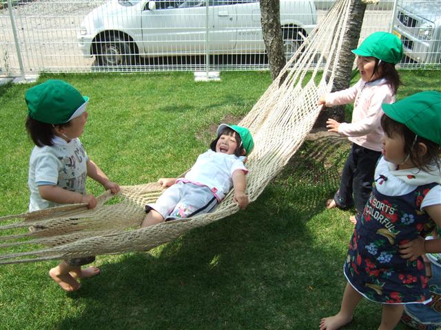 「新手のダイエット運動」ではありません。 元気などんぐりの子ども達と先生の図です。 今日は、新しい遊具が登場しました!! その名も!!! 「ハンモック」・・・・・。 普通ですね・・・・。 でも、乗ると気持ちいいですよ・・・・。 面白いですよ~~~。 落ちても下は、芝生だから痛くないですよ~~~。 えんちょう、実はもう1個?1枚? ハンモックが欲しいのです・・・。 お天気が良い日は、お庭にありますので どなたでも、乗ってみてください!! えっ?体重制限? 大丈夫ですよ~~~!! えんちょうも乗れました!! えんちょうの体重ですか? 聞きたい? 聞きたくない? 強制的に覚えていただきます。 0.093㌧です。 えんちょう調べましたよ~~~!! 希望?目標の体重は0.075㌧ぐらいなので 以下の計算式が成り立ちます! 毎月1kg.減らすと仮定して