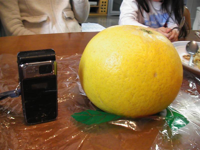 先日のえんちょう家です。 お買い物に行き、子ども達が見つけた 巨大みかん、もとい「ばんぺいゆ」です。 またもや登場の、えんちょうの汚い携帯と比べてみました。 外側も大きいですが、皮も厚かった・・・。 味は・・・・。おおきなものは大味ということで・・・。 子ども達は、初めて見るおおきな物体に 大興奮しながら、喜んで食べていました。