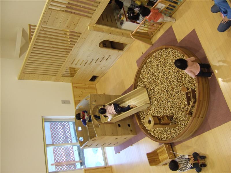 どんぐりの行事(ひのき屋さん+おもちつき会)で ホールを使用するために、一時撤去?されていた 木の砂場や組み立てハウス、おままごとセットが 復活しました! どんぐりさんの室内の臭いや、子ども達の遊ぶ音 は、やっぱりこれがないとダメですね。 良い木の臭いと、ガラガラと木の音がする どんぐりさんが帰ってきました!
