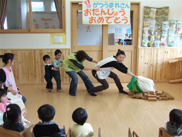 きょうのどんぐりさんは! 11月生まれさんの、お誕生会!! ここのところ、先生方の出しもの(お楽しみ)が 徐々に、パワーアップして来まして。 前回は、アンパンマンがアンパンを届けに来たり・・・。 今回は「大きなかぶ」でした!! お誕生日さんも参加して、頑張って抜きました! 先生方のパワーアップは 子ども達にとって、とっても良いことです! 他の先生はネタを考えるのが、だんだんややこしくなる・・・。 がんばれ!先生方!! (↑人事のようで、ごめんなさい。本当は応援しながら、嬉しく思ってます。)