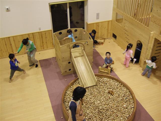さて、きょうのどんぐりさんは! 2Fの事務室からのホール (ホール←正式名称はプレイルームです・・・。でも、だれも呼んでくれない・・・。) からの、眺めです!! いつもと違う目線から見ると新鮮ですよ!