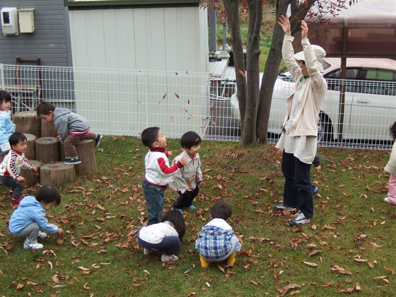 さあさあ、月曜日です! 元気に今週もがんばりましょう!! 今日のどんぐりさんは「外遊び」です。 午後は、カミナリもなって雨でしたが、午前中は11月としては暖かったですね。 説明はいらない写真かなと思って、この写真にしました。 必死で枯葉を拾う子ども達 先生の投げた枯葉を目で追う子ども達 子ども達の笑顔で十分です。はい。