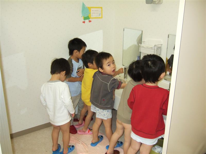 今日のどんぐりさんは!(←「来週のさざえさんは!」的に読んでください) 「トイレでなぞのノーパン集会!!」 別に集会ではありません・・・。 トイレを頑張ったお友達が、手を自分で洗っているだけです・・・。 一見、異様な雰囲気ですが、本人たちはいたってまじめに取り組んでます。 写真撮ったりして、ごめんね・・・。
